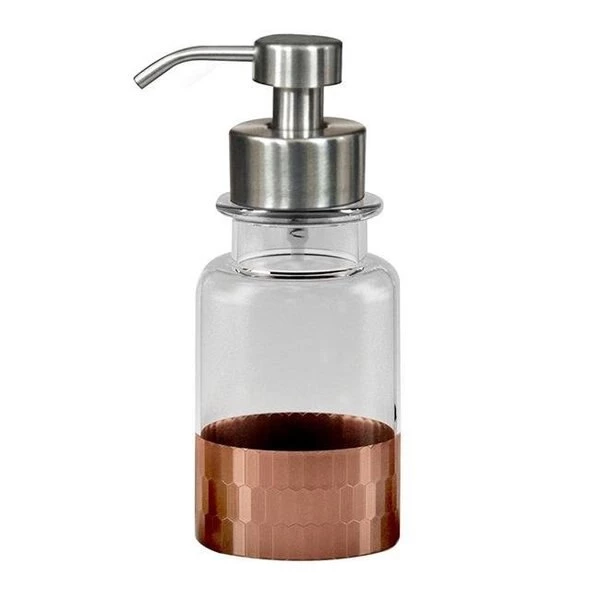 The Glass Foam Pump with metal trim. Our Small Foaming Soap Dispenser features a clean and clear glass base and metal foam pump with Copperfinish. Fill and refill with your favorite foaming soap and sit sink side for a beautiful touch. FeaturesGlass Foam Pump. CopperClean with damp clothesLooks great in bath or kitchenWide opening for easy refillsSpecificationsColor: CopperWeight: 3 lbs
