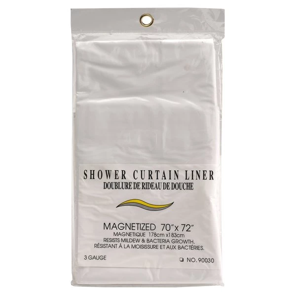 Shower curtain liner helps keep water inside the tub area. Fits most standard size showers. 70"x72"