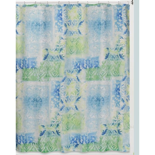 Weathered tile-work in azure and turquoise hues printed on 100% textured linen polyester shower curtain transport you straight to the Mediterranean. The sun-drenched palette exudes a casual vacation vibe. Coordinates to other Calypso accessories and bath rug sold else where on this site. Shower curtain liner recommended. 72" x 72"