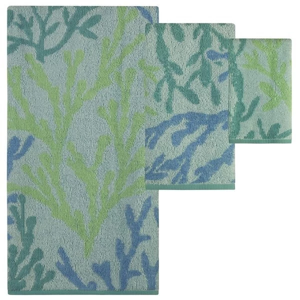 Visit the tropical waters of the Caribbean with our magical cool turquoise and azure blue Coral marine life interpretaton on 100% cotton jacquard towels. Machine Wash, tumble dry. Coordinates to other Fantasy Reef accessories, shower curtain, towels and rug sold else where on this site. 12" x 18"