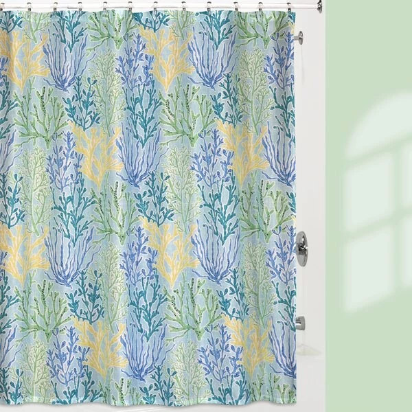 Visit the tropical waters of the Caribbean with our magical cool turquoise and azure blue Coral marine life interpretaton, print on a 100% polyester-taffeta shower curtain. Coordinates to other Fantasy Reef accessories, rug and towels sold else where on this site. Makes for a breezey look. Machine wash, tumble dry. Shower curtain liner recommended. 72" x 72"