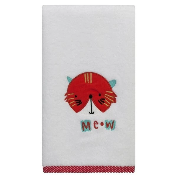 Bring your bath to life with this super cute and fun whimsical kitty design. Different Kitties are fun for the bath. Individual Kitty appliqued and embroidered detailed towels with red coordinating hem trim. 100% cotton. Macine wash, tumble dry. Coordinates to other Kitty accessories, rug, shower curtain and towels sold else where on this site. 12"x16.5"