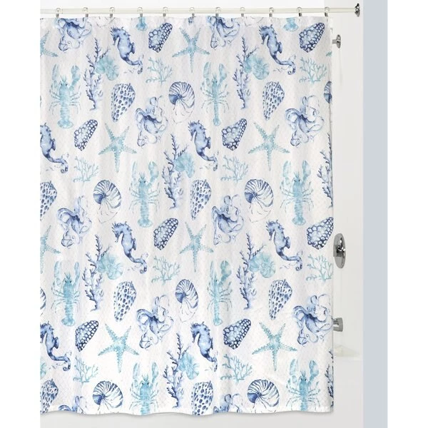 Explore the deep blue sea with iconic tossed sealife motifs in azure blues and cool aqua tonalities printed on a 100% polyester-taffta shower. Coordinates with other Nantucket accessories and rug sold else where on this site to complete this fresh maritime theme. Machine wash, tumble dry. Shower curtain liner recommend. 72"x72"