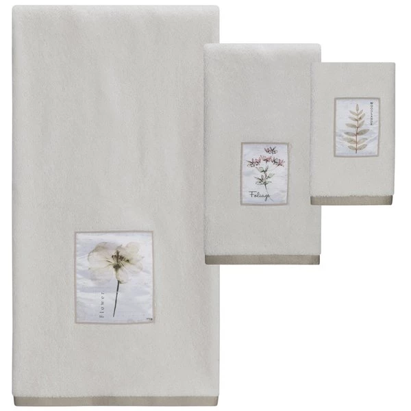 100% cotton with satin printed motif appliqued towels with contrasting end hems. Coordinates to other Pressed Leaves accessories, shower curtain, rug and towels sold else where on this site to create a chic new classic. Machine wash, tumble dry. 27"x52"