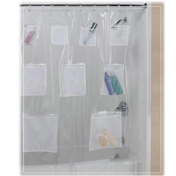 A clear viny Shower Curtain with 9 Varying sized mesh pockets to hold your bath essentials.Style your home with furniture that exemplifies your exquisite taste. Choose from an amazing array of relaxing and luxurious beds. sofas. tables and more to the get a perfect piece of fixture for every space in your home or office.72 x 72 in. Clear Pocket Shower Curtain. SpecificationsSize: 72 X 72 in.