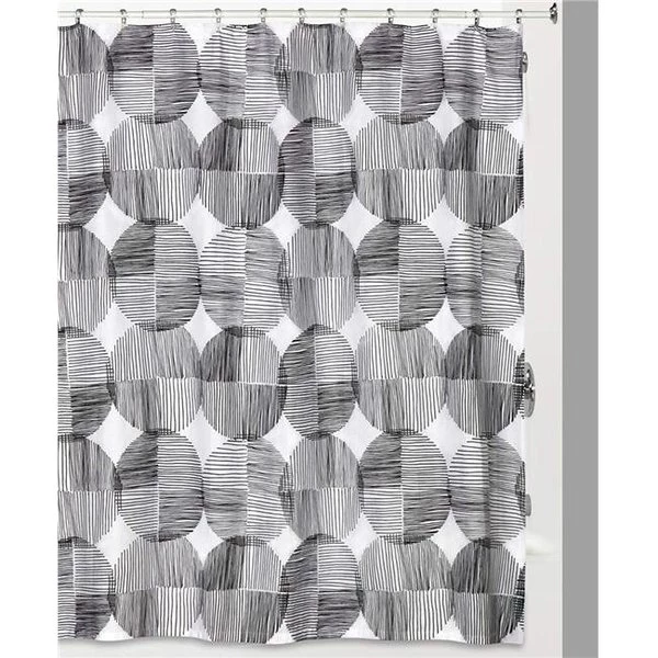 Metro Circles Modern geometric Shower Curtain composed of hand drawn lines and circles printed on poly /cotton FeaturesIncludes one Shower CurtainMade of 100 Percent CottonMachine WashShower Curtain liner recommededSpecificationsMaterial: CottonColor: White. BlackWidth: 72 in.Length: 72 in.Weight: 2.72 lbs