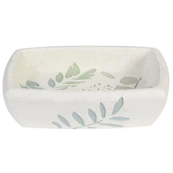 Springtime resin Soap Dish with natural surface textures and recessed leaf motifs . displayed there is our entire product line up of housewares Decor and storage products. SpecificationsLength: 5.75 in.Height: 1.5 in.Width: 4 in.Color: SageMaterial: ResinWeight: 1.32 lbs