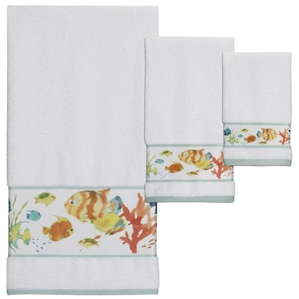 Visit the Caribbean with our whimsical watercolor fish printed on our wide width print border towel with constracting hem. Coordinates to other Rainbow Fish towels, shower curtain, rug and accessories to complete a this sparking tropical under-the-sea story. Machine wash tumble dry. 11"x18"