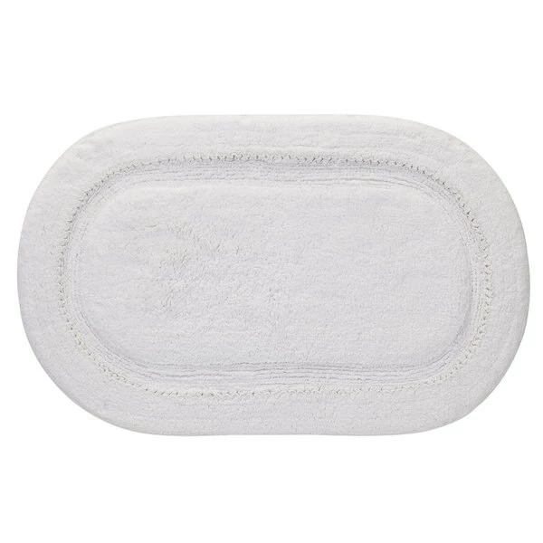 White looks right in almost any setting and the bathroom is no exception. Oval 21 x 34" rug with made of 100% cotton has ruffles and high low texture. Coordinates to other Ruffles accessories, shower curtain, towels and hooks sold else where on this site.This look is timeless for any bathroom. Machine wash, tumble dry. 34"x21"