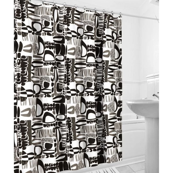 Characterized by simplicity, minimalism and functionality our contemporary pattern consisting of assorted organic geometric forms in a bold black/white palette is printed on a poly/cotton twill fabric shower curtain. Shower curtain liner recommended. Buttonhole top for easy installation. Machine wash, tumble dry. 72"x72