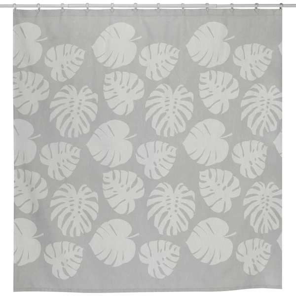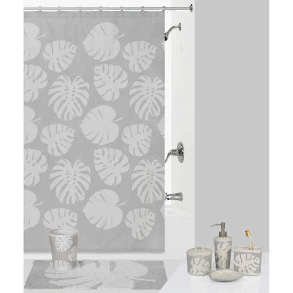 Retreat to a far-away island with our impressively large-scale tropical leaves design in cool gray and off-white sophisticated bi-color print on a linen textured 52/48 cotton/polyester faille fabric shower curtain for a relaxed eco-graphic theme. Buttonhole top for easy installation. Shower curtain liner recommended. Coordinates to other Tropical Leaves accessories and rug. 7"x72"