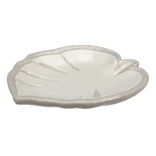 Retreat to a far-away island with our impressively large-scale tropical leaves design in cool gray and off-white sophisticated bi-color print on decorative ceramic accessories are enhanced with similar linen tetured bodies and glossy off white leaves in bas-relief. Hand wash. Coordinates to other Tropical Leaves accessories and rug complete this relazed eco-graphic theme. 5"x5.75"x1"H