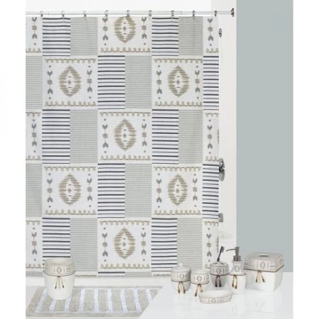 $29.19Original price was: $29.19.$22.18Current price is: $22.18.Inspired by the American Souhwest, our patchwork composition of eclectic iconic desert motifs and ticking stripes in natural tonalities, are printed on a cotton/polyester textured shower curtain panel, creating a sophisticated new direction. Coordinates to Due accessories and rug sld else where on this site. Shower curtain liner recommended. 72" x 72"