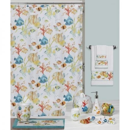 $22.50Original price was: $22.50.$18.00Current price is: $18.00.Visit the Caribbean with our whimsical watercolor fish printed on 100% polyester-taffeta fabric shower curtain. Coordinates with other Rainbow Fish accessories, rug and towels sold else where on this site. to complete this sparking tropical under-the-sea story. Buttonhole top for easy installation. Machine wash, tumble dry. 72"x72"