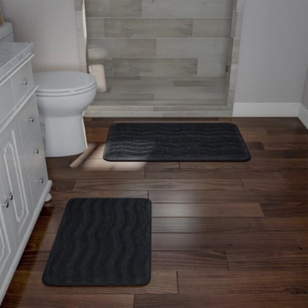 Hastings Home 2-piece Bathroom Rug Set, Memory Foam Mats, Wavy Microfiber Non-Slip Absorbent Runner, Black