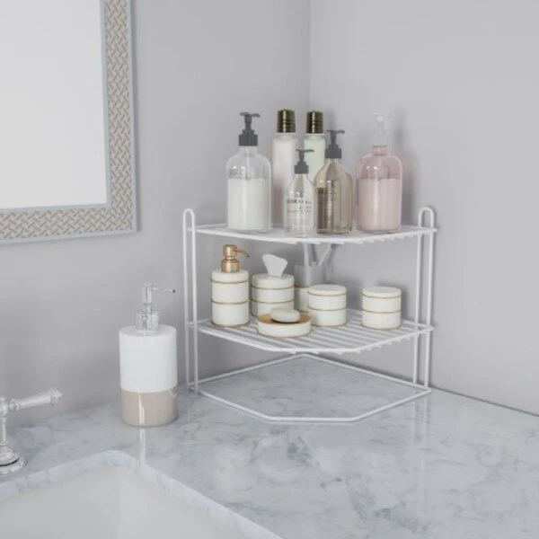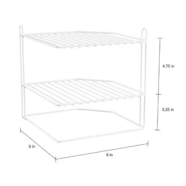 Keep your kitchen neat and organized with the Two-Tiered Corner Shelf by Hastings Home. This two-tiered shelf has a triangular design to conveniently fit into corners, freeing up space in kitchens with limited counter or cupboard space. The organizer is made of iron and has a powder coating to protect it from rust, corrosion and abrasions, ensuring that it will last for years to come. The bottom shelf has a 3.75-inch clearance and the top shelf has a 4.75-inch clearance, making them perfect for storing dishes or spices. This organizer features a single-piece construction, meaning there is no assembly required and It's ready to use straight out of the box! This shelf is also great for use in your office, bathroom or laundry room to keep your home clutter free.