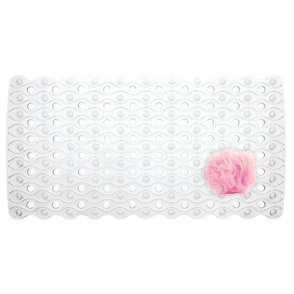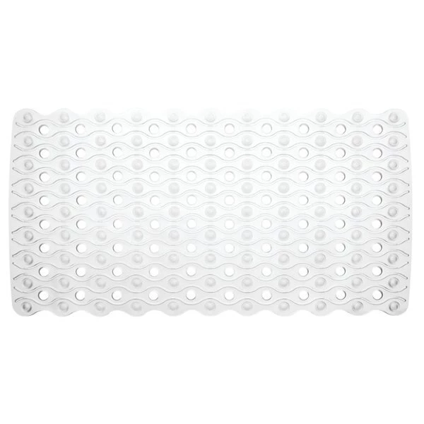 Bathtub Shower Mat <p>Drive Medical's bath mat holds securely to your tub with multiple suction cups, allowing for a slip-free bathing experience. The bath mat provides a large and secure surface area in the tub. Its soft rubber mat is as easy to clean and can be rolled up for storage. This product also features a contour cut out specifically designed to fit around your drain.</p><strong>Features and Benefits</strong><ul><li>Mat is held securely by multiple suction cups</li><li>Extra-long bath mat adds safety and security by providing a large, slip-proof, surface in the bath</li><li>Soft rubber mat is easy to clean and roll up for storage</li><li>Mat has a contour-cut design to fit around drain</li><li>Mold resistant latex-free rubber</li><li><strong>Product Specifications</strong><ul><li>Actual Product Weight: 2.4 lbs</li><li>Overall Product Height: 0.2"</li><li>Overall Product Length: 35.5"</li><li>Overall Product Width: 15.75"</li><li>Primary Product Color: White</li><li>Primary Product Material: Rubber</li><li>Warranty: 90 Day Limited</li><li>Model # 12950 </li><li> No Assembly Required </li></ul></li></ul>