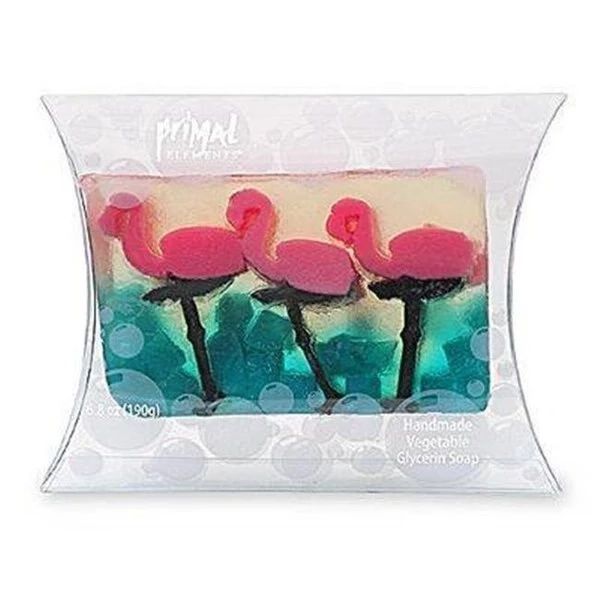 FeaturesClassic deco colors. this bar is laced with bergamot. cedar. linden blossom and flamingos.We take great pride in the soap we produce.All soaps contain vegetable glycerin which moisturizes the skin with a luxurious rich lather that will leave skin feeling silky smooth.eye-catching images make Primal Elements soaps visually unique. while our creative fragrances truly set our products apart.