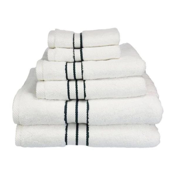 These ultra-soft towels create a spa experience. These updated 900 GSM towels feature triple stripes in the center of the towel and a hanging hook for easy hanging. Treat yourself to this lush. beautiful towel set for an easy way to revitalize your bath decor. This towel can also be found in various other colors. Towel Set includes – Two Bath Towels. Two Hand Towels and Two Face Towels.FeaturesPattern – Solid Terry ClothDouble PLYMaterials – 100% Egyptian CottonEach towel is featured with a hanging hook for easy hangingCare instructions – Machine WashableTwo Bath Towels – 30 x 55 in.Two Hand Towels – 20 x 30 in.Two Face Towels – 13 x 13 in.6 pieceColor – White With Teal Border
