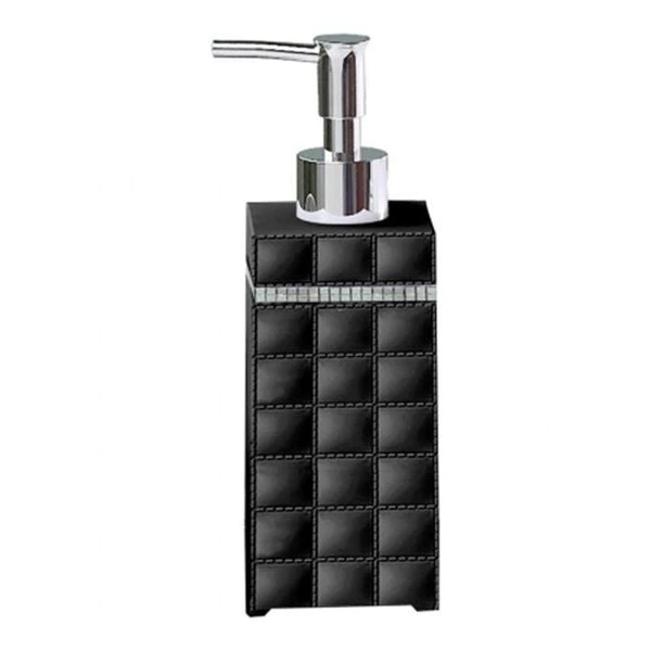 Black resin bath accessories. Matching pieces include cotton swabcotton container.soap dish.toothbrush holder.tumbler.soap and lotion pump.wastebasket.boutique tissue & amenity trayDimesnions:.li>Length:2.56Height:2.56Width:7.88