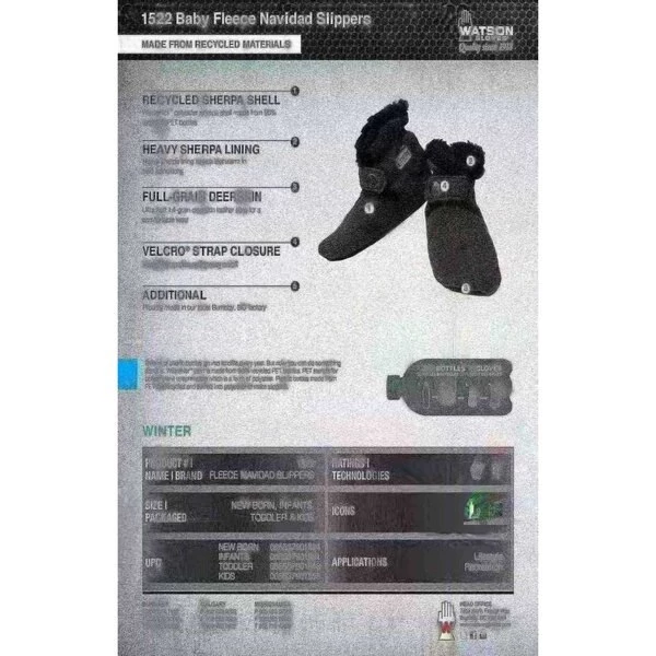 WasteNot polyester sherpa shell made from 96% recycled PET bottles. Heavy sherpa lining keeps feet warm in cold conditions. Ultra soft full-grain deerskin leather sole for a comfortable wear. hook and loop strap closure for easy on/off.